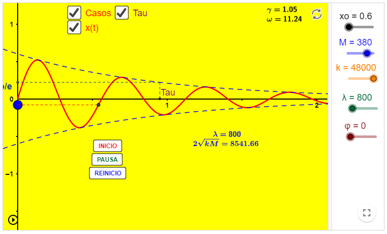 Por otra parte, con la finalidad de completar el análisis de este tipo de sistema mecánico, se dispone del siguiente applet, el cual simula el movimiento oscilatorio amortiguado de una esfera, aunque no se muestra el resorte elástico ni el mecanismo disipador de energía. El mismo permite graficar simultaneamente con las casillas x(t) y v(t) , la posición y la velocidad del sistema; se pueden variar los diferentes parámetros con los deslizadores x o (amplitud), M (masa), k (constante elástica), λ (coeficiente de amortiguamiento) y φ (ángulo de fase). La casilla Tau permite calcular τ , es decir, el intervalo de tiempo para que la amplitud x o disminuya hasta 0,37 x o ; también se muestra cómo determinar su valor directamente de la gráfica. Por otra parte, se calculan los valores de τ , ω y T. También contiene información teórica del sistema en la casilla Casos donde se describen los diferentes casos particulares a saber: MAS, sub amortiguado, críticamente amortiguado y sobre amortiguado; los cuales se pueden identificar comparando entre si los valores de λ con 2(kM) 1/2 , o T o con 2πτ , como se ha mencionado antes.